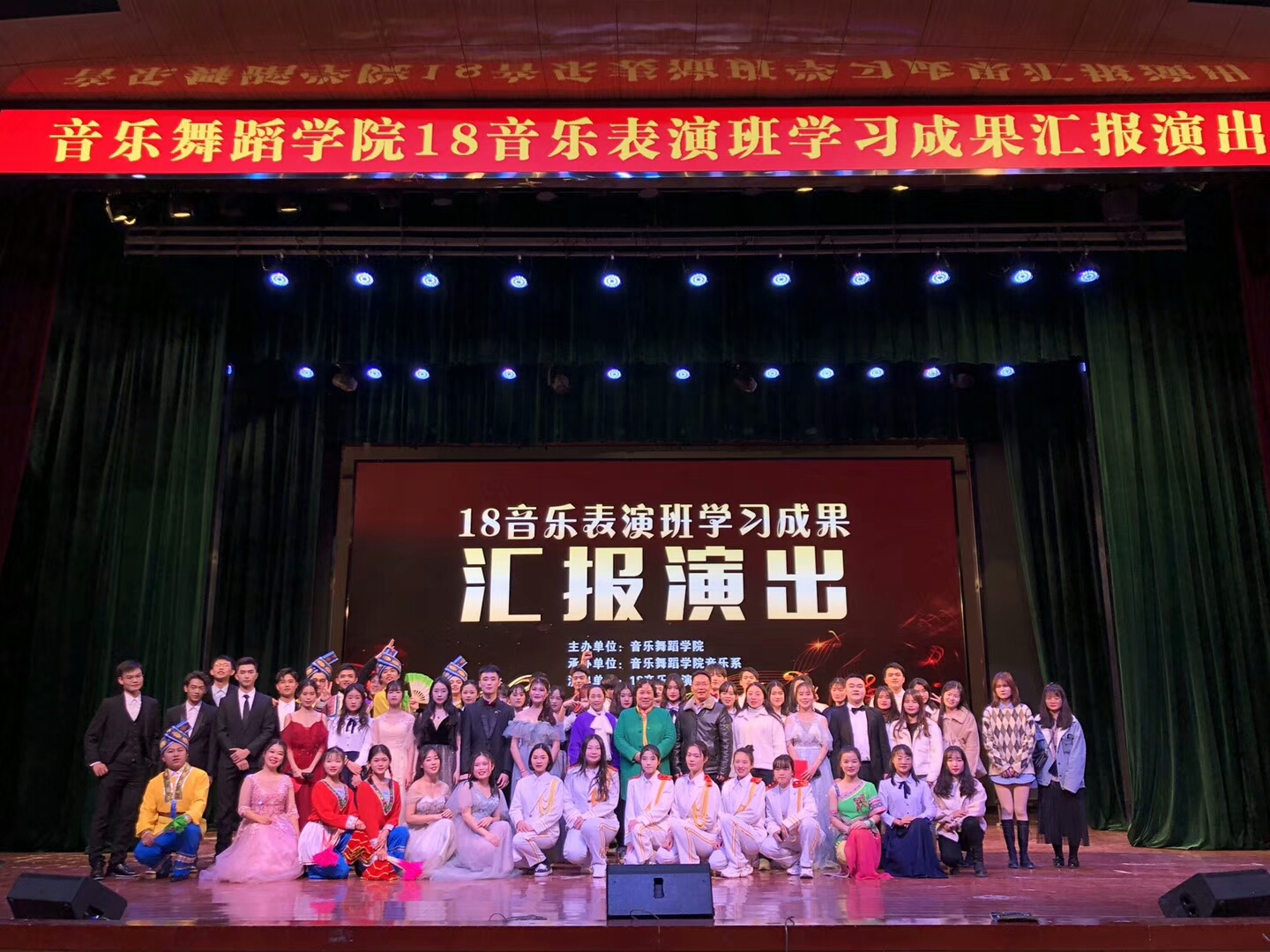 最后,集体演唱校歌《吾校光芒》“北山苍苍,龙水汤汤……求真朴实,创辉煌”,歌声澎湃,自信高昂。本次成果汇报演出,在老师的指导、同学们的协作下,圆满的完成了对自身的检测,更是对2018级音乐表演班一年学习的肯定。