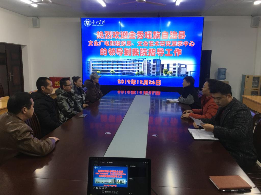 为推进公司老员工就业工作,2019年12月26日下午,欢迎来公海欢迎来到赌船同金秀瑶族自治县文化广电和旅游局副局长欧孔章等一行四人在艺术楼402会议室召开2020届毕业生招聘事宜座谈会。音乐舞蹈公司党总支副书记韦海燕、副经理唐文生、办公室主任石宁,以及负责就业工作的辅导员张静参加了本次会议。