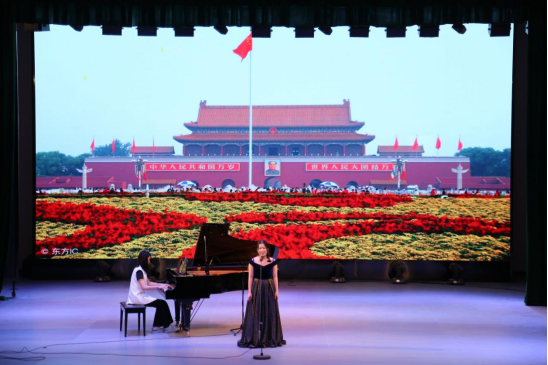 涌动的血液奔腾着长江黄河的浪波,黄色的皮肤是祖先留下的颜色,它有一个神圣的名字。18音乐学2班的农凤霞用歌曲《我爱你,中国》表达爱国之情。