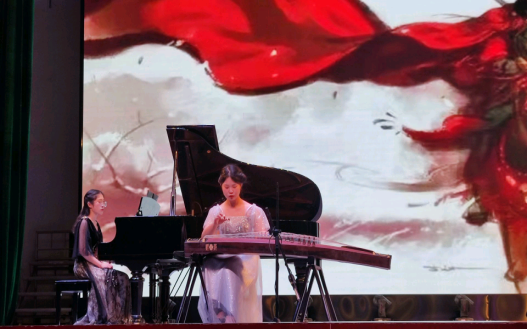 由彭暘曦同学带来二胡独奏《战马奔腾》,为了表现乐曲内容,他运用了一些特殊演奏技巧。如用“大击弓”,以模仿马蹄飞奔声;用双弦快速抖动表现冲锋时的厮杀声;用快速的连顿入弓和下滑音的结合模仿马鸣声等,把群众带到战马嘶鸣,风驰电掣般飞奔,冲锋陷阵,顽强斗争的艺术情境之中。同时同学们还给大家带来了《春风十里》《青花瓷》、《一程山水一程歌》、《年少有为》、《青玉案元夕》、《醒来的人》、《老师我想你》、《恒河上升起太阳》、《月光近月光远》等作品,这些作品就像阳光和雨露,滋润着观众的心田。