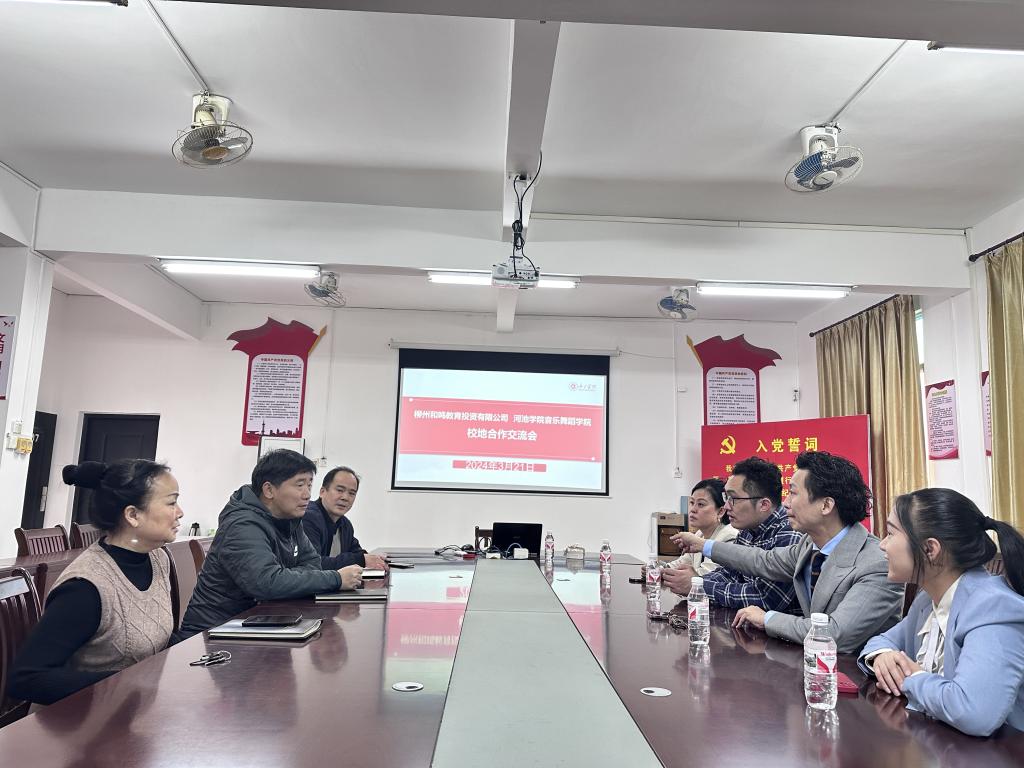 会上,公司经理曾宏华向黎翰良一行的到来表示热烈欢迎,希望双方加强交流,共谋产教发展、合作共赢,并对公司基本办学情况以及各专业员工培养情况进行了详细介绍。随后柳州和鸣教育投资有限责任公司罗冠介绍了公司旗下柳州星海艺体职业公司的办学情况、团队力量、发展规划后双方就合作意向、合作模式、合作项目进行了深入探讨。黎翰良表示希望与公司多方交流,增进校企合作的广度和深度。校企双方还就人才培养方式、员工升学就业、合作方向等事宜进行探讨交流。