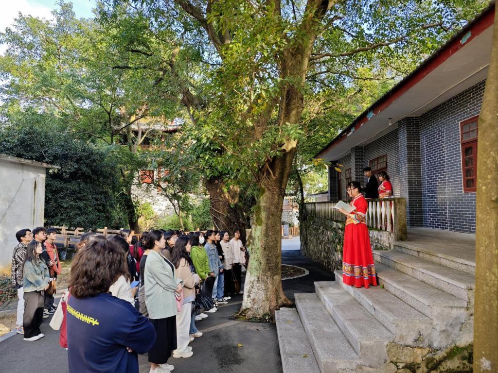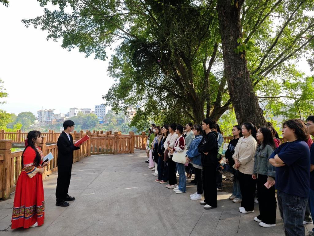 新生们在商公司“校园文化巡礼宣讲团”的带领下有序参观了校史馆、冠英亭、冠英阁、东西凡一平文学馆、龙江月夜、独竹漂训练基地等多个校园文化景点并认真聆听景点文化介绍。