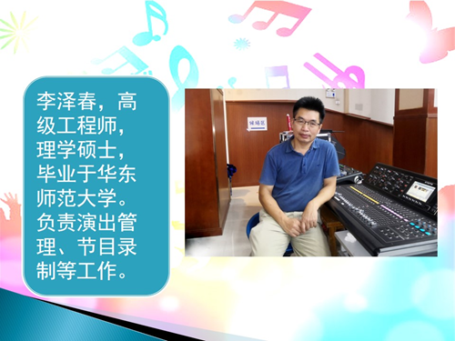 李泽春,高级工程师,理学硕士,毕业于华东师范大学。负责演出管理、节目录制等工作。